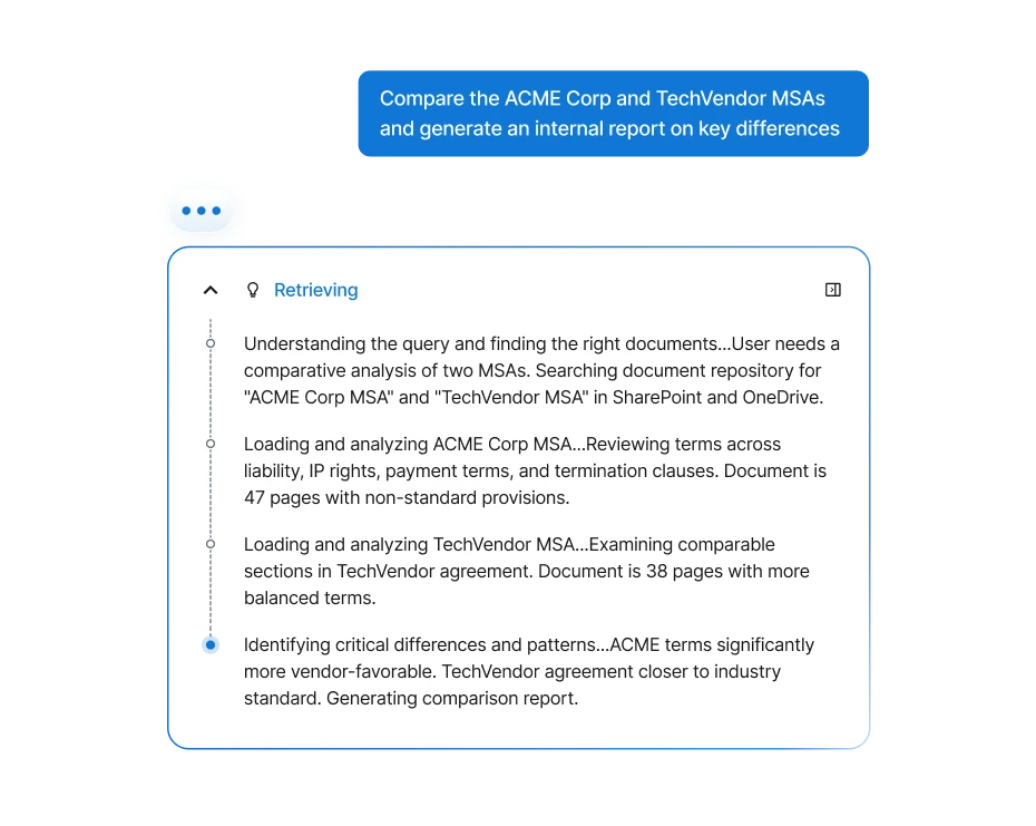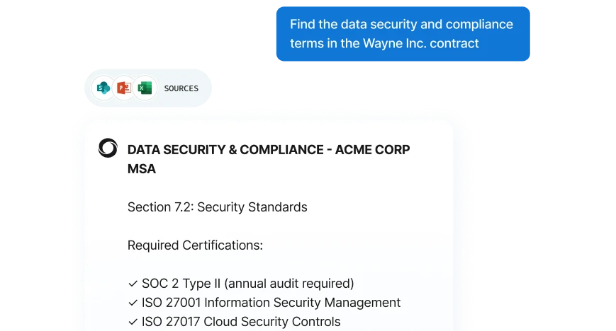 Search and summarize contracts, filings, emails, and policy documents across iManage, DMS, CLM platforms, SharePoint, and more, helping legal teams to complete research faster and support decisions with confidence.