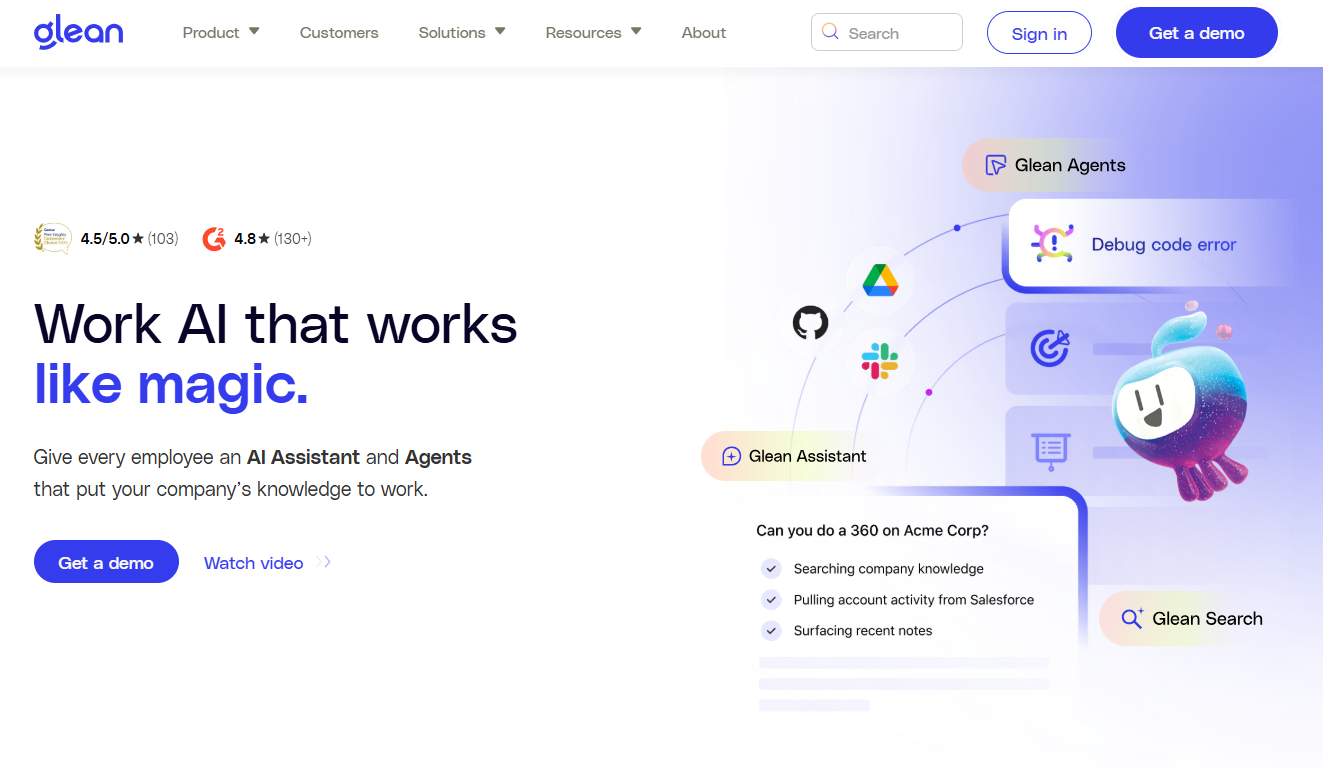 Glean is an “AI for work” platform built to improve enterprise knowledge discovery by unifying information scattered across emails, documents, chats, applications, and knowledge bases. By integrating with a wide range of business tools, it creates a single search experience that helps employees find relevant information quickly and work more efficiently.