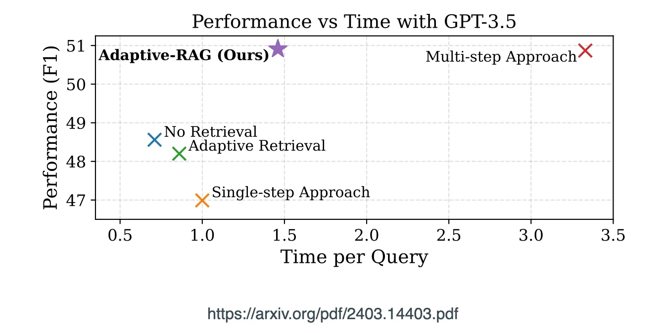 Considering the graph below, it is evident that an intelligent approach is required to balance query time, quality in terms of performance, efficiency, and cost. Adaptive-RAG provides this balance, enabling RAG-based enterprise seamlessly by choosing the most appropriate retrieval strategy for every query complexity.