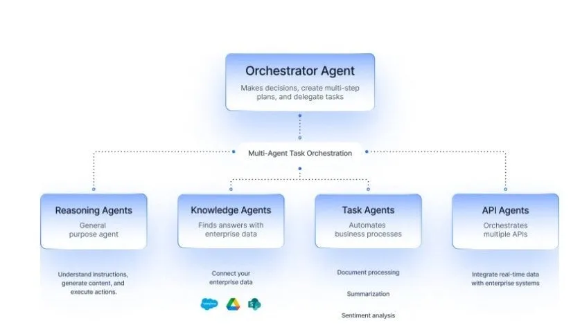 - Multi-agent orchestration: It supports the coordination of multiple AI agents working in tandem, ensuring smooth, efficient process automation across departments.