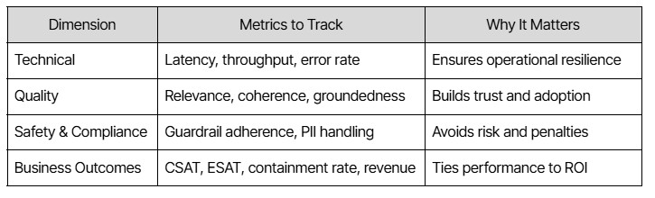 - Business-level: Measure outcomes linked to KPIs - resolution time, containment, CSAT/NPS.