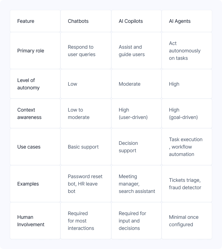 Put simply, choosing between a chatbot, copilot, or agent isn’t just about features but more about fit.