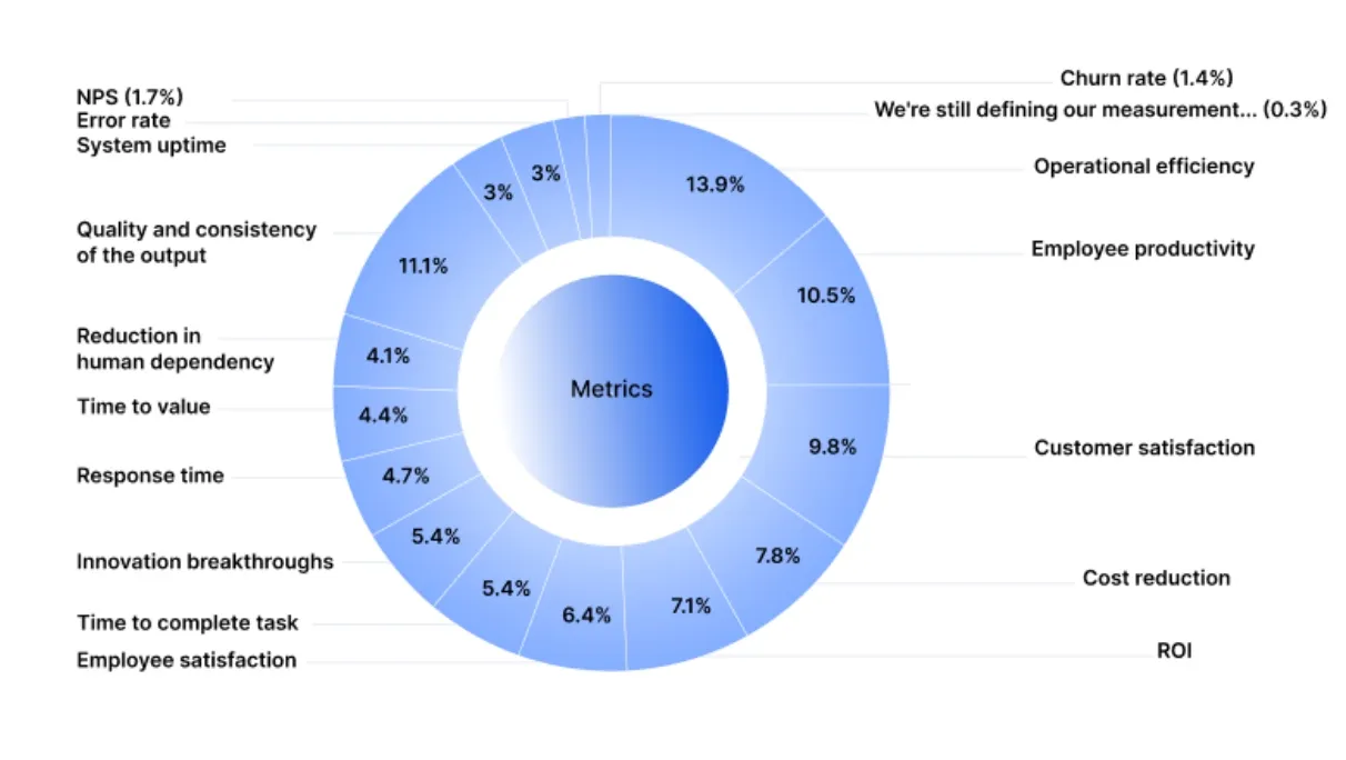 The top success metrics include operational efficiency (13.9%), employee productivity (10.5%), and output quality and consistency (11%). These indicators reflect a shift away from experimental hype toward outcome-driven deployment.