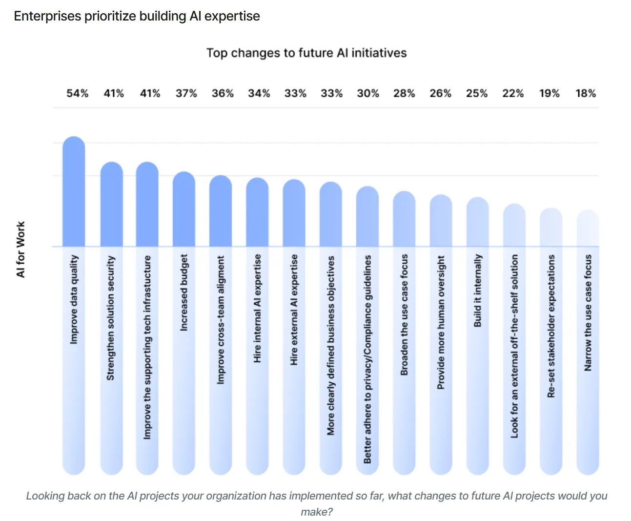 When asked, “Looking back on AI projects, what changes in future projects would you make?” 67% of respondents cite that they plan to strengthen AI expertise, with 34% focusing on internal upskilling and 33% hiring external talent. This shift underscores the growing need for AI fluency across business and technical teams—a foundational requirement for scale.
