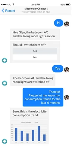 Using the NLP capabilities, chatbots can translate complex machine language into simple natural language. For example, the chatbot can recommend the user to switch off the appliances when the users move out of house and intimate them if there are faults in the appliances.