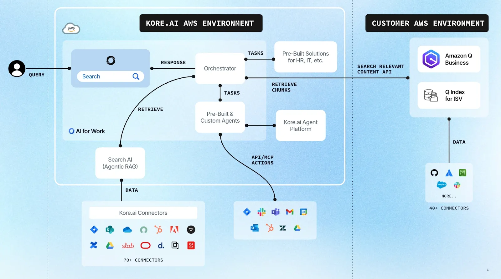 - Unified Search & Action: Employees can discover information across 90+ enterprise systems (Kore Connectors + Amazon Q Connectors) and immediately act on it, all in one interface.