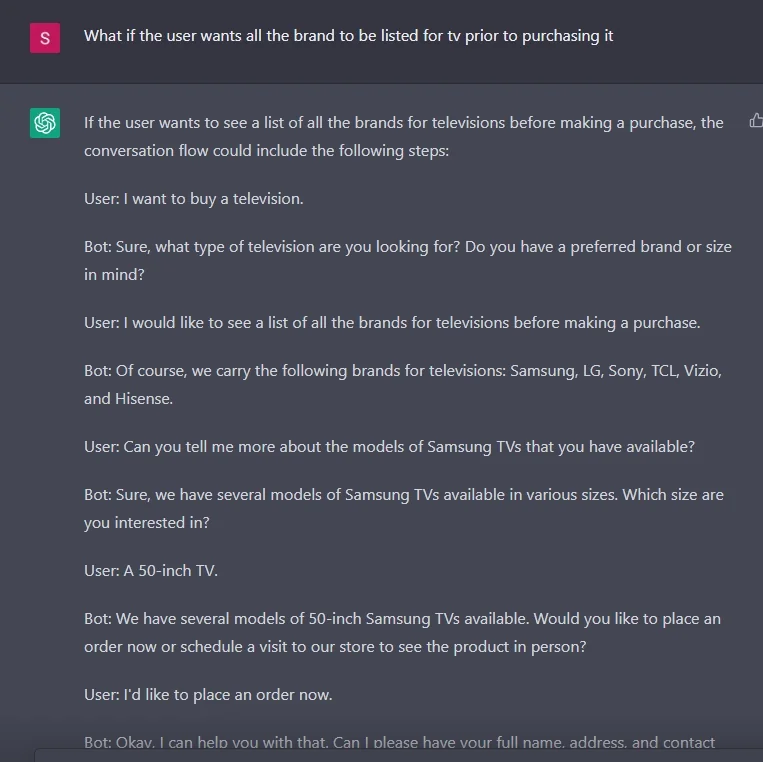 Now, consider a scenario where your users are in the mood for a new TV, but they're open to suggestions. They want to explore various brands and models. ChatGPT can craft a conversation flow that gently leads users through the world of TV options.
