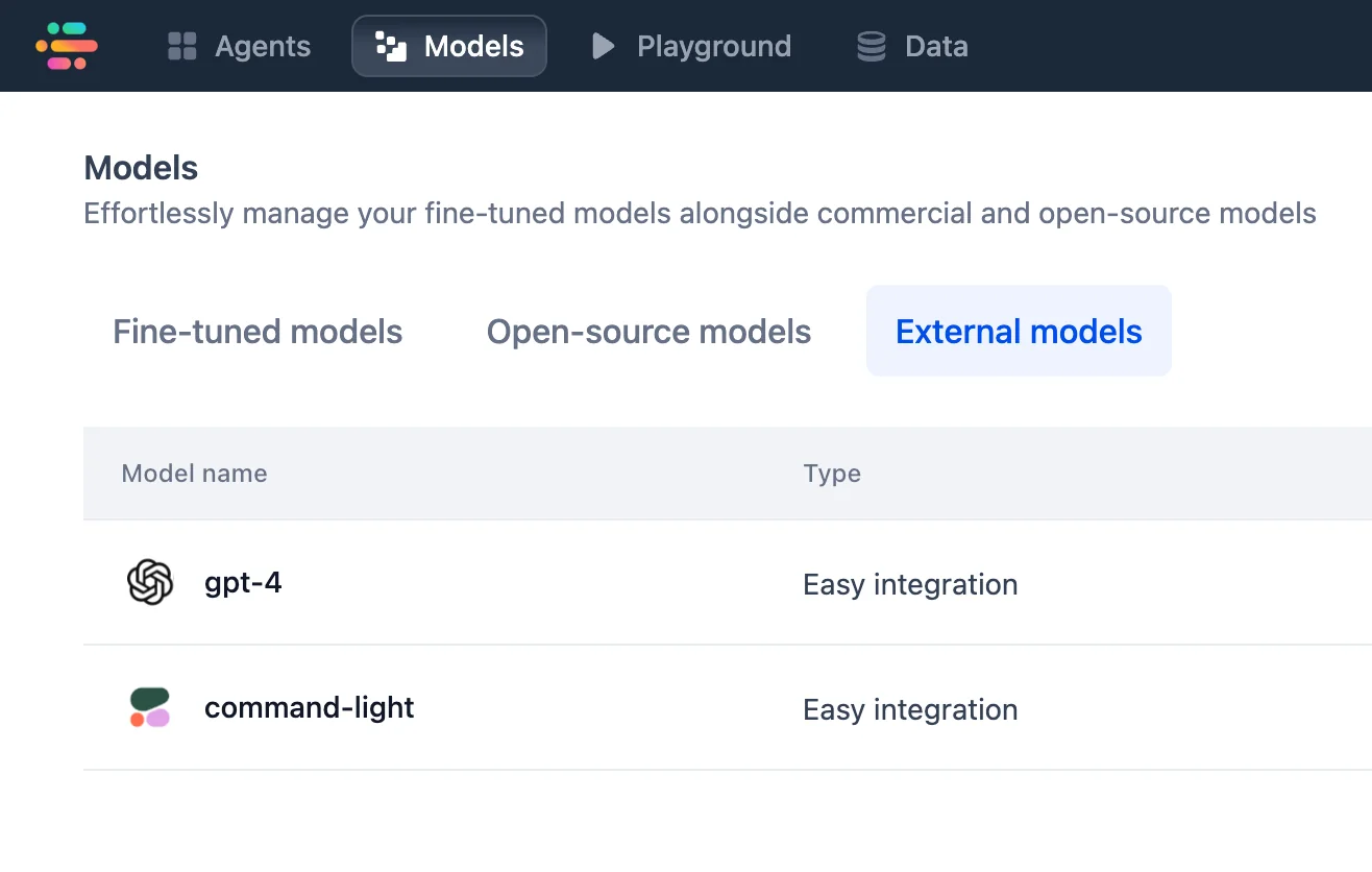 Considering the image below, traditional LLMs can be added under External models. Or a whole host of Open-sourced models can be added, and easily exposed via an API.