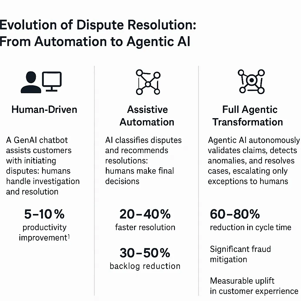 Previously, a GenAI chatbot was introduced to help customers initiate a dispute claim (collecting basic info via chat). However, all investigation and resolution steps still fell to human agents in the back office. Outcome: a modest 5–10% productivity improvement, as the bot saved some time on data entry but did not speed up the overall resolution significantly. The cycle time for resolving disputes remained lengthy, and human teams struggled to keep up with volume.