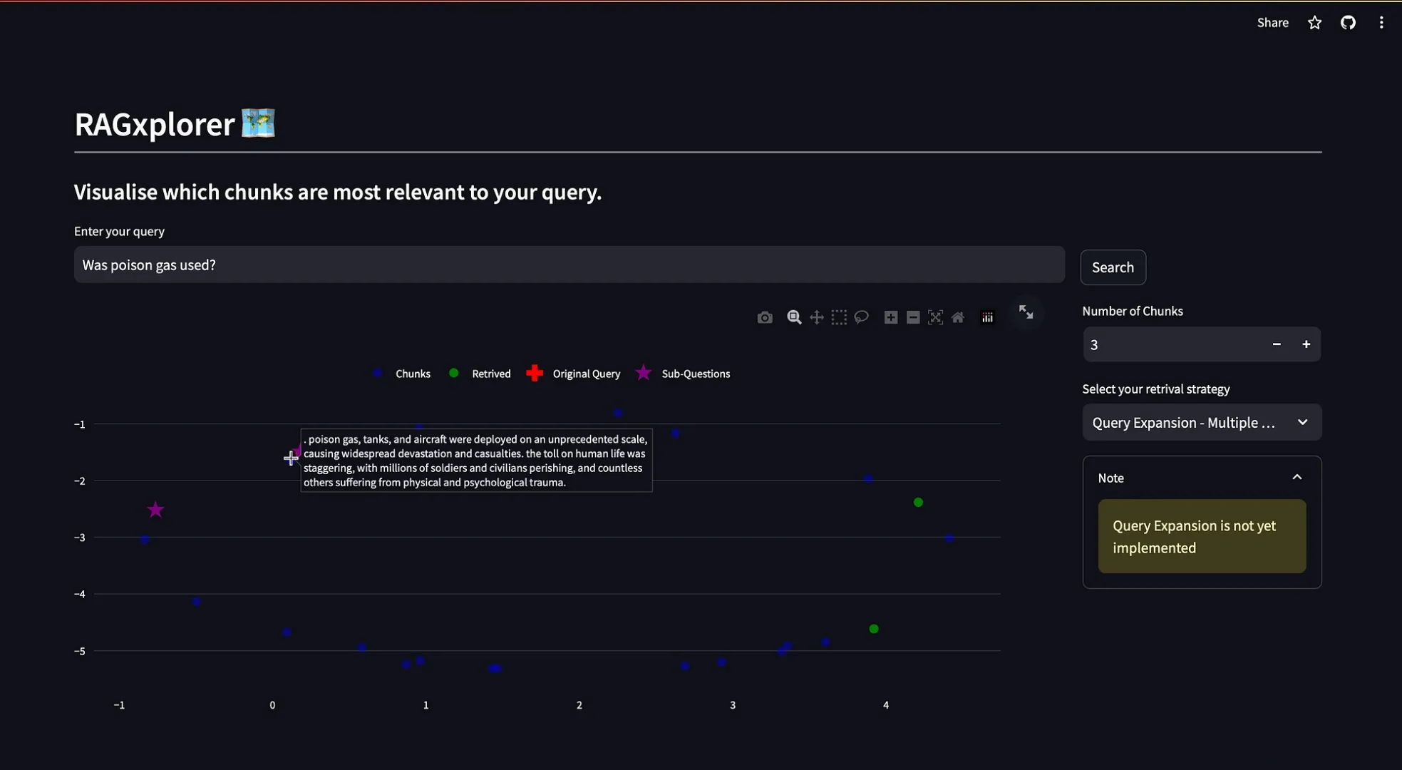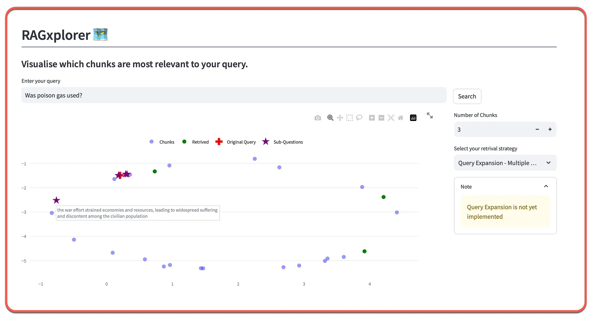 RAGxplorer is an interactive tool for visualising document chunks in the embedding space. Designed to explore the semantic relation between chunks, and mapping which chunks are linked to a specific user input.