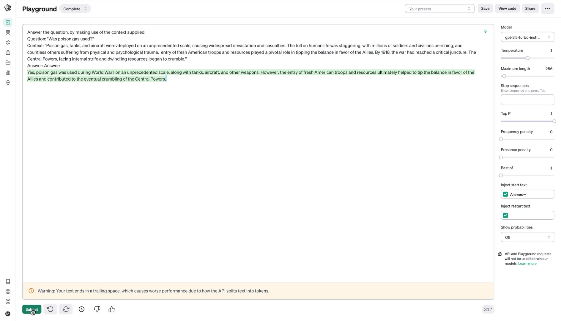 The image below from the OpenAI playground shows how the context from the chunk can be injected into a prompt. So the instruction is defined, with the question and the context which serves as reference.
