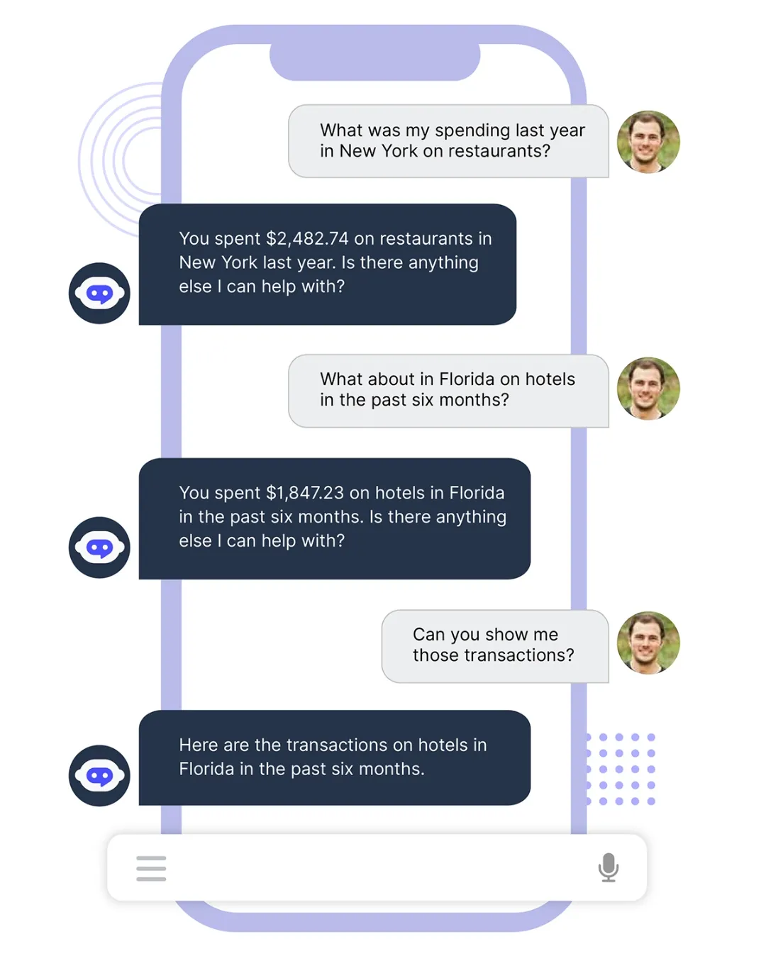 Here, we can see a user asking about their spending on 1) merchant type, 2) location and 3) timeframe, and then following up without re-specifying they are asking about their spending, but updating the merchant type, location and timeframe, and the IVA is able to understand what the user is asking about and provide the appropriate information.